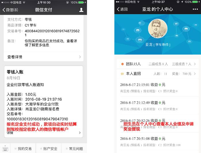 1、平台上每报名成功一个学员,驾校指定专人会收到微信零钱到帐通知,通知内容包含学员姓名、报名车型内容。