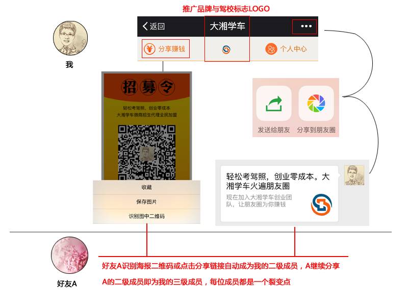 我分享给A,A分享给B...通过裂爆点层层分享,形成全民招生团队