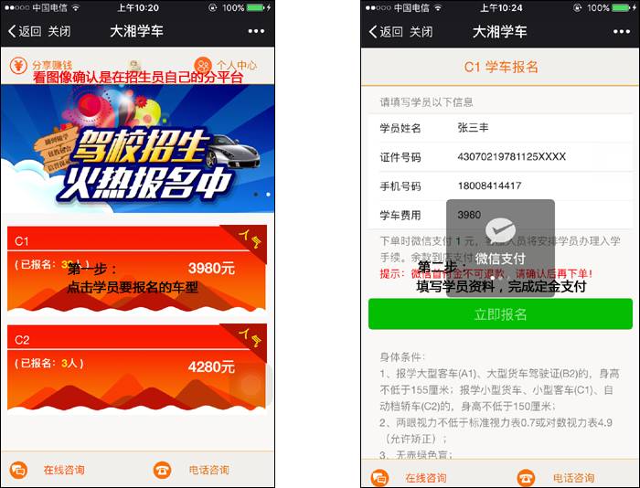 招生员进入自己的分销平台,选择学员需要报名的班型。在提交界面录入报名信息并按驾校的预付金要求通过微信支付完成付款,报名成功。
