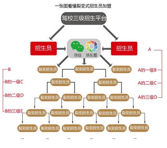 三级裂变分销招生是利用互联网社交分享平台无限发展招生代理,分销式网络成几何式裂变。